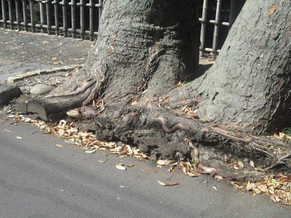 写真中:欅B(辰巳濠東道路) 道路にはみ出した幹根が削られたが成長に影響はない。