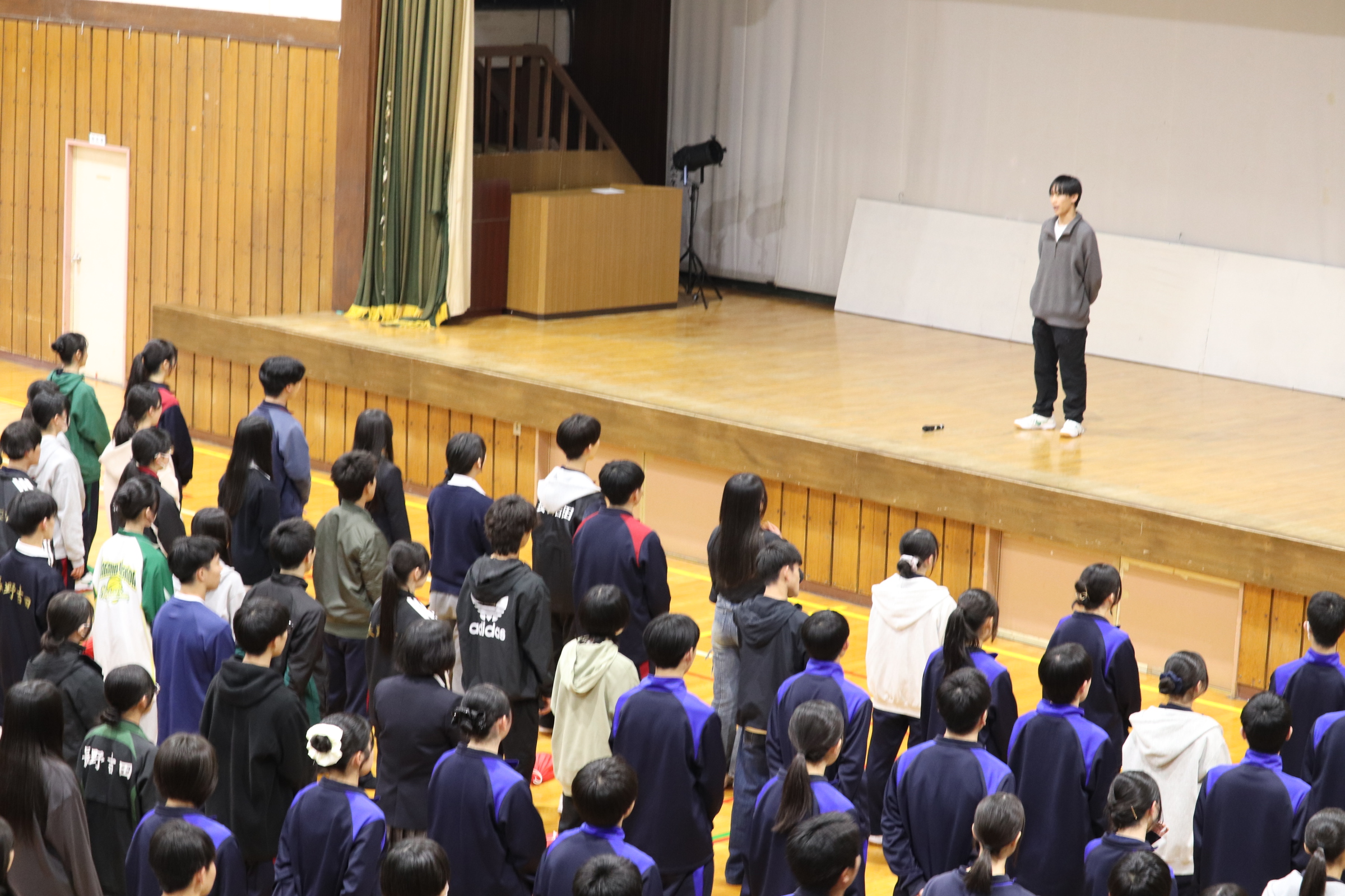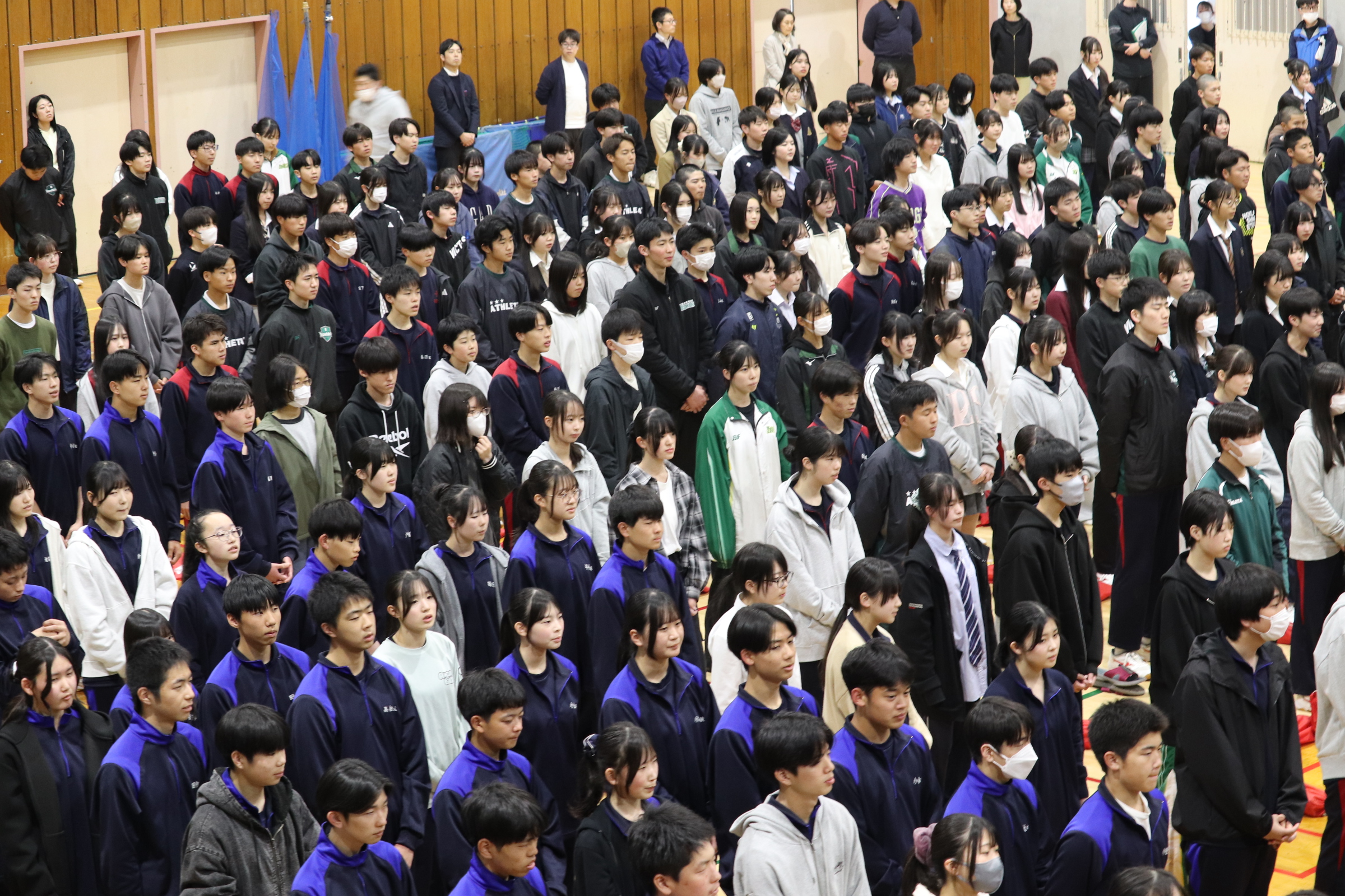 全校で応援練習を行いました! 4月23日(木)放課後、全校で三・三・七拍子の練習と応援練習を行いました。1年生は応援練習の成果を、2.3年生は先輩として1年生の手本となるように校歌を歌っていました。壮行会本番でも選手が最高のパフォーマンスを出せるよう精一杯声を出して歌いたいですね!